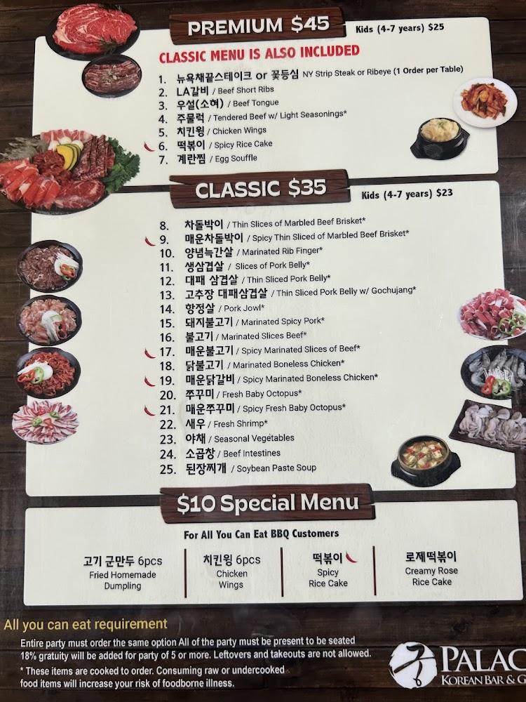 The menu at Palace BBQ is extensive and diverse. Guests can choose from an array of meats, side dishes, and soups. Signature items like bulgogi and assorted banchan stand out. Customers can also try hearty stews like yukgaejang or kimchi jjigae. Vegetarians will appreciate options like vegetable bibimbap and tofu dishes.